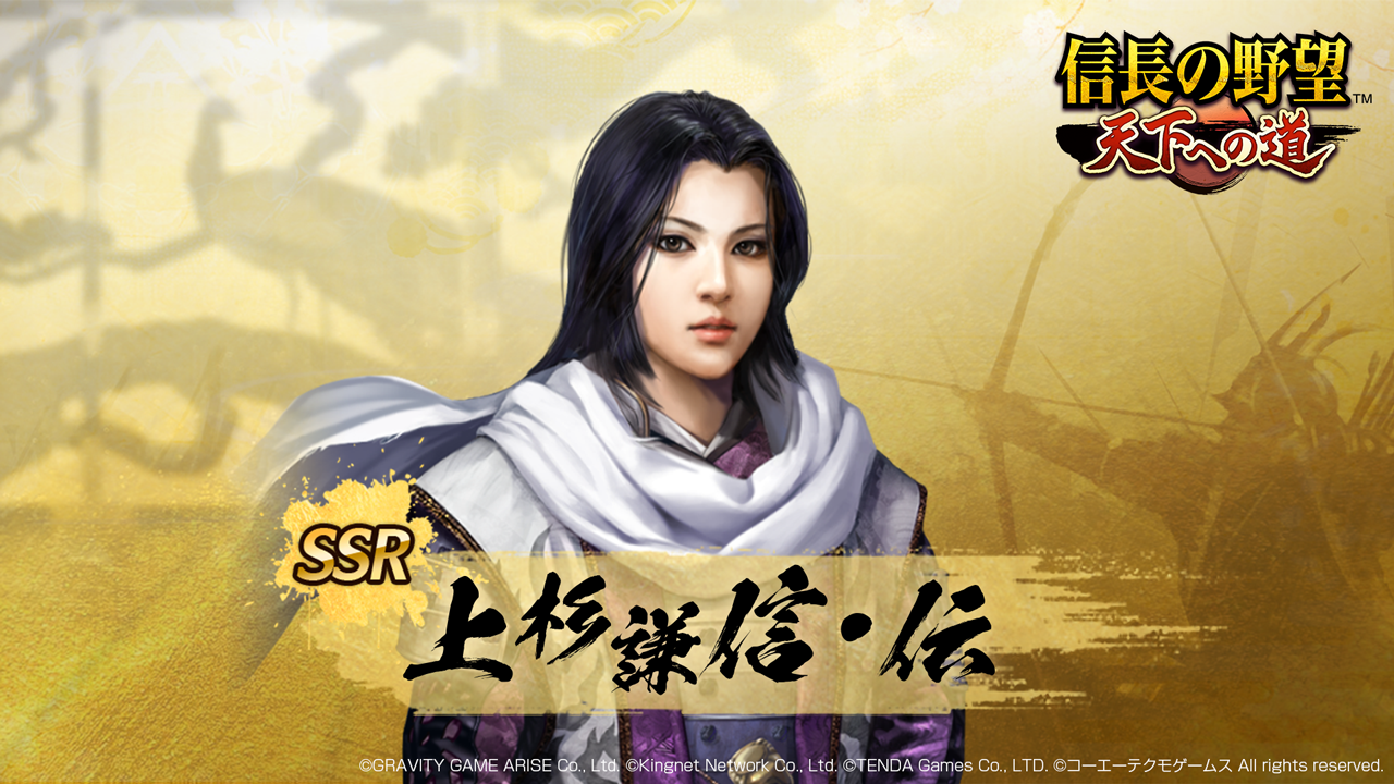 列伝:越後の戦国大名。為景の娘。兄・晴景が病弱のため、国人たちによって当主に擁立される。「毘」の軍旗を翻して疾駆する姿は軍神と恐れられた。『信長の野望・天道』で戦国時代の逸話や異説として唱えられている“if”を再現した「伝承イベント」に登場した。
